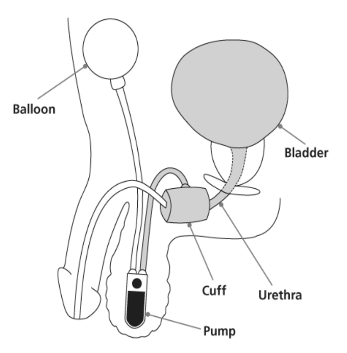 The device consists of a cuff, a pump and a reservoir balloon. The cuff is placed around the urethra (water pipe). The pump is put in the scrotum. This pump is the part the patient squeezes to activate and deactivate the device. The reservoir balloon is placed in the lower abdomen and is filled with a sterile saline solution. This inflates the cuff, preventing urine from flowing and deflates the cuff allowing the urine to flow.