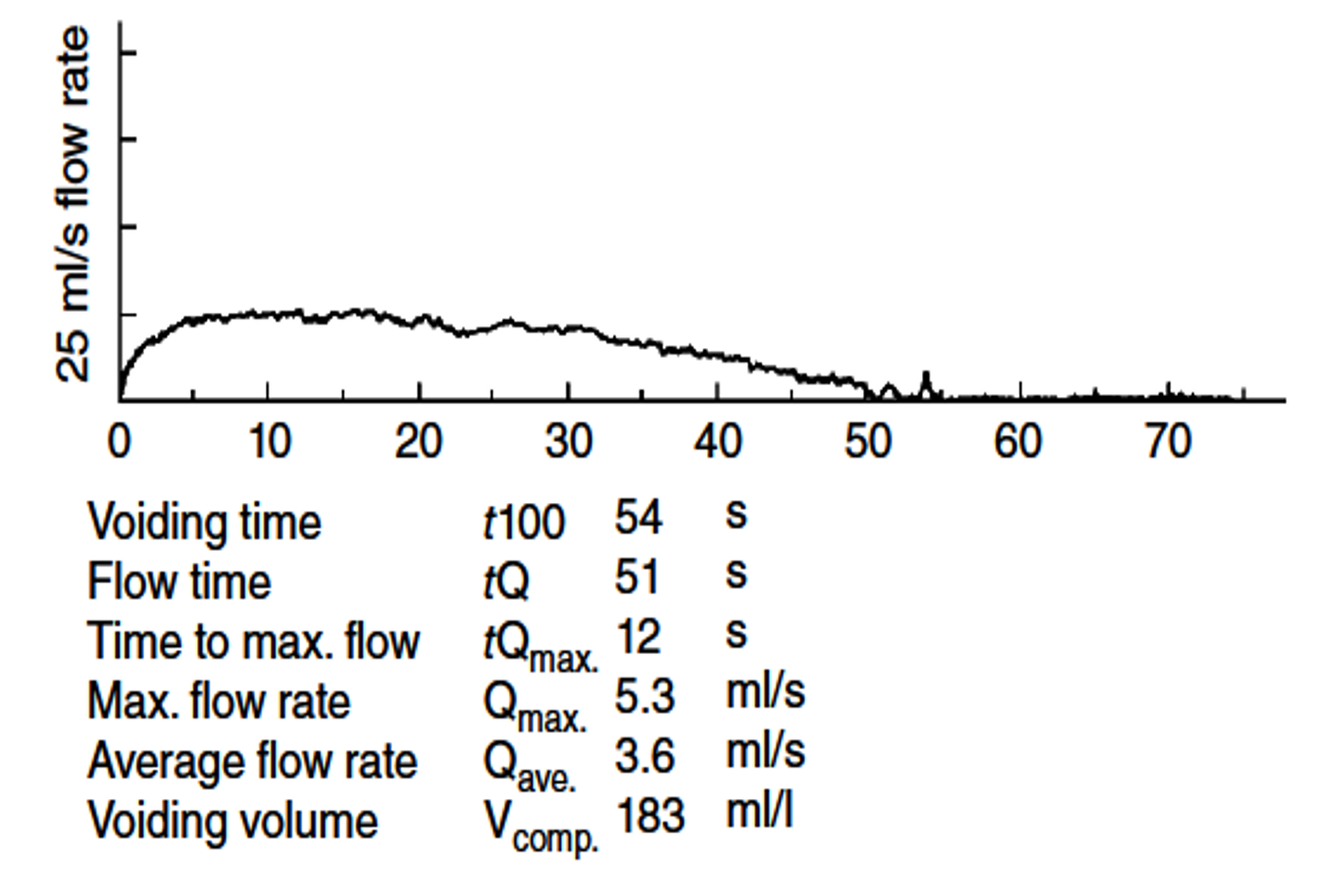 - The typical obstructed flow pattern has a plateau-shaped curve with a prolonged flow time, sustained low flow rate, and increased time to Qmax.